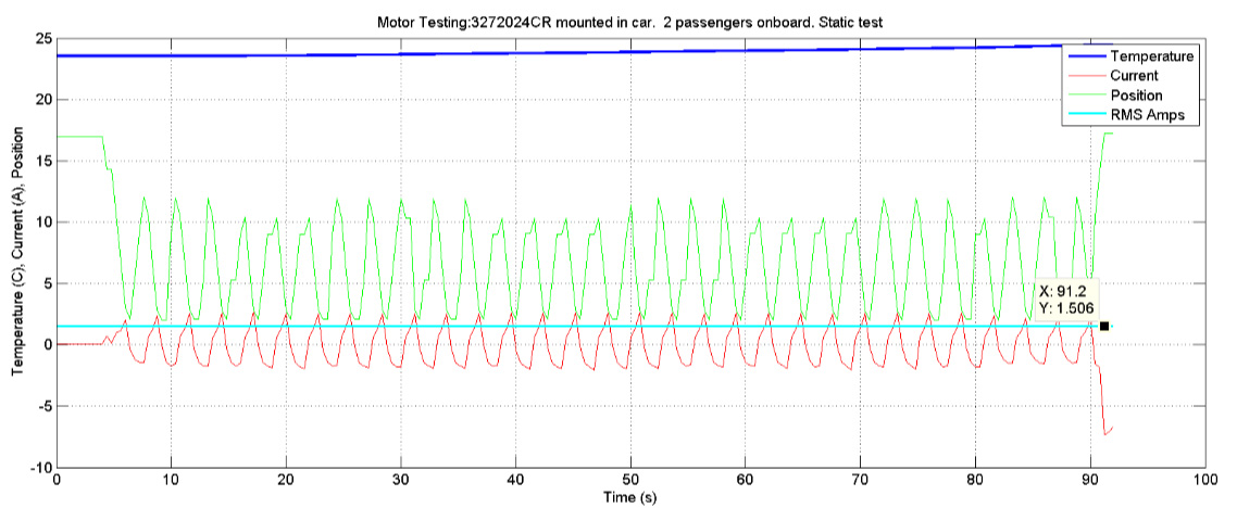 The modified actuator was mounted in one corner of the car to test static steering performance using the testing cycle and controller. Teams tested the vehicle with no passengers, then one and two passengers. As seen in the figure below, with two passengers, the actuators used 1.5A RMS, which roughly corresponds to an output force of 600N in the actuator and can be maintained at a 100% duty cycle with this motor.