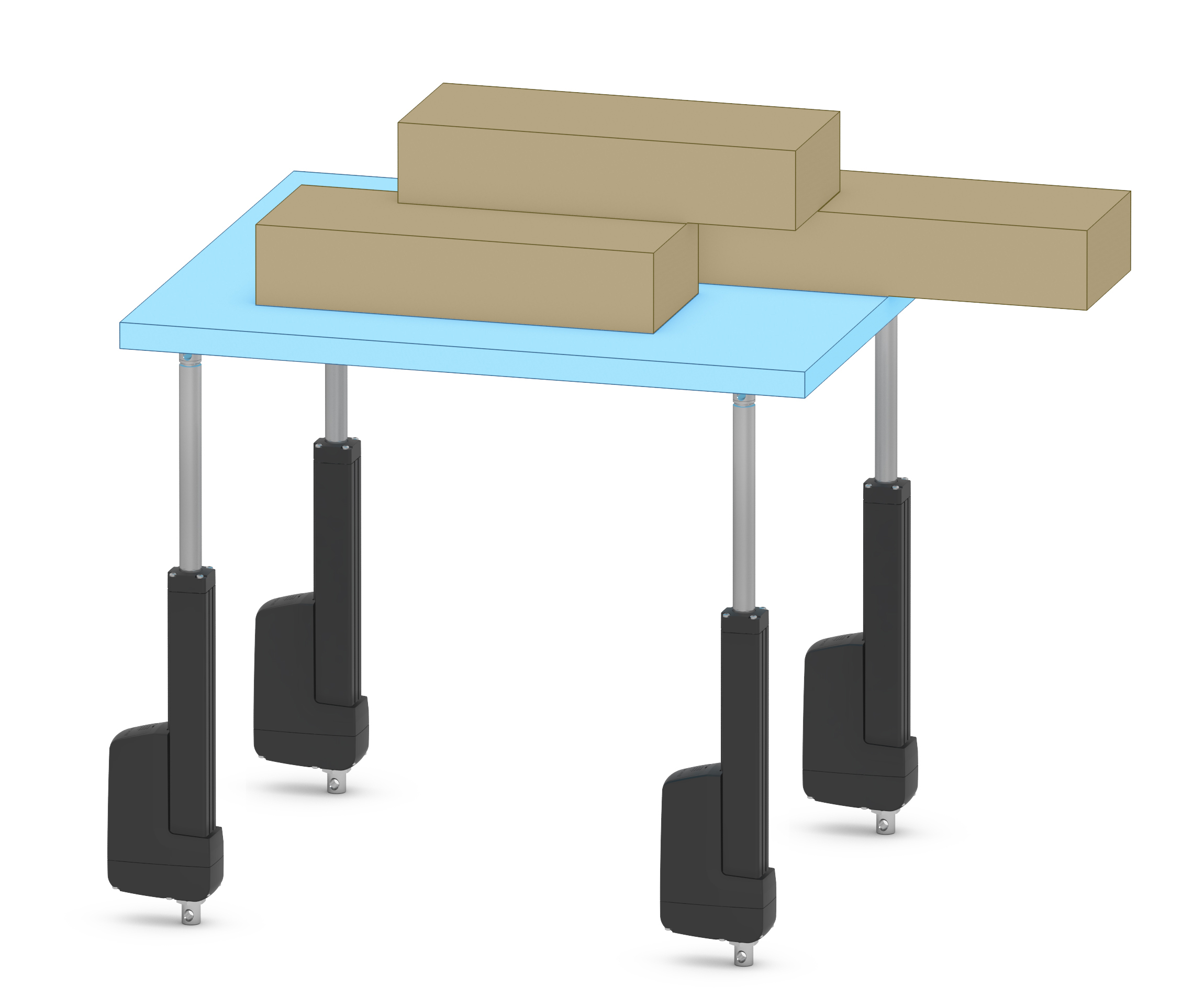 The smart linear actuator can be easily incorporated into an existing or new system design. For example, synchronization of multiple actuators is easy to program. (Image 2) A popular application for this is the ergonomic raising and lowering of assembly fixtures to fit the operator. The integrated controls simplify the wiring and eliminate the external controls. The master will be controlled by a voltage signal, and the subsidiary actuators will be wired to the master using the onboard electronics. This allows designers to utilize synchronization to achieve a balanced load no matter how awkward it may be. This control feature eliminates bouncing and damage caused to actuators fighting each other trying to move uneven loads. There are also telescoping column actuators where the motor and gearing are inside the column, to deliver a more aesthetically pleasing solution.