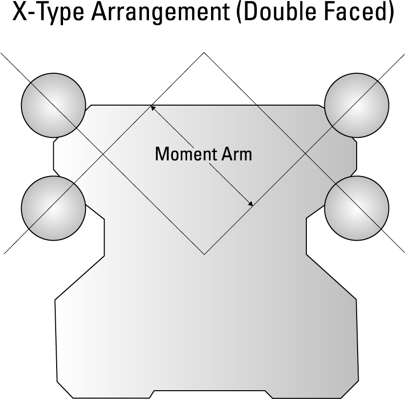 Figure 2. The O-type arrangement features double-backed profile rail further from the center of rotation for a higher resistance to moment loads. This configuration, however, cannot tolerate misalignment or surface imperfection.